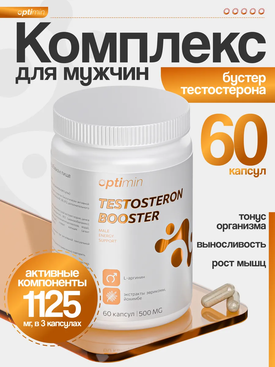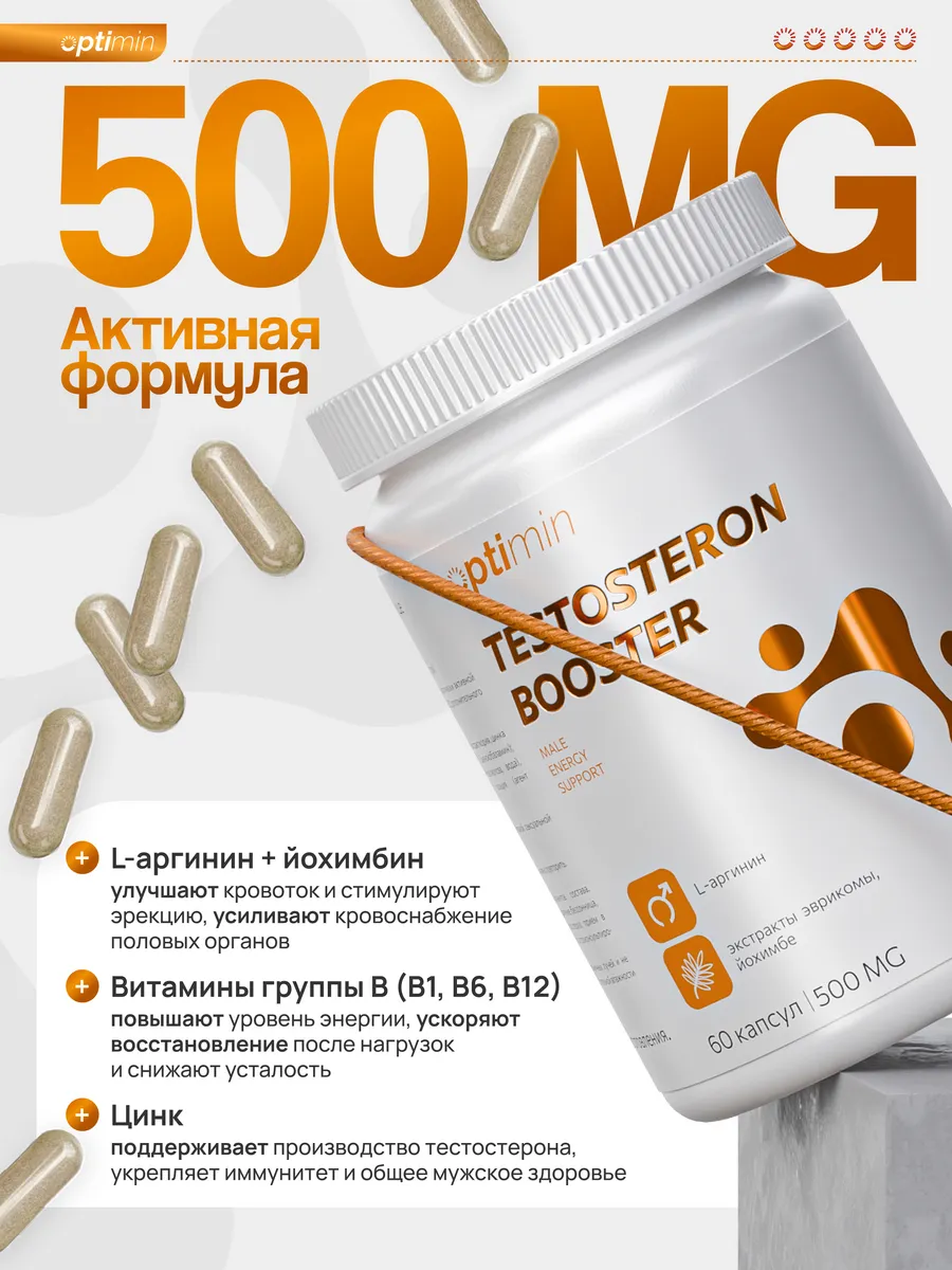 L-аргинин, сухой экстракт коры йохимбе, эврикомы сухой экстракт корня, цинка лактат, витамин В1 (тиамин), витамин В6 (пиридоксин), В12 (цианокобаламин); вспомогательные компоненты: капсула (гидроксипропилметилцеллюлоза, вода), диоксид кремния (антислеживающий агент), стеарат кальция (антислеживающий агент), мальтодекстрин (наполнитель)
